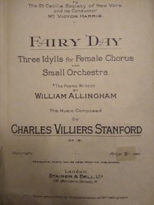 In the meantime, while looking for additional works for the concert that fit with the instrumentation and theme, a deep dive through the IMSLP public domain online music library found C.V. Stanford’s Fairy Day – Three Idylls for Female Chorus and Small Orchestra (1912). A search through IMSLP and elsewhere on the Internet found no trace of the instrumental parts. The search did reveal a wonderful new recording of works by C.V. Stanford by the Ulster Orchestra, in Northern Ireland (A Song of Agincourt & other works,2019), which included Fairy Day. Correspondence with the orchestra staff in Ireland led us to the editor of the orchestral material, Jeremy Dibble, Professor of Musicology at Durham University and author of numerous books on British and Irish composers. Professor Dibble was generous enough to e-mail the entire set of scores and parts.