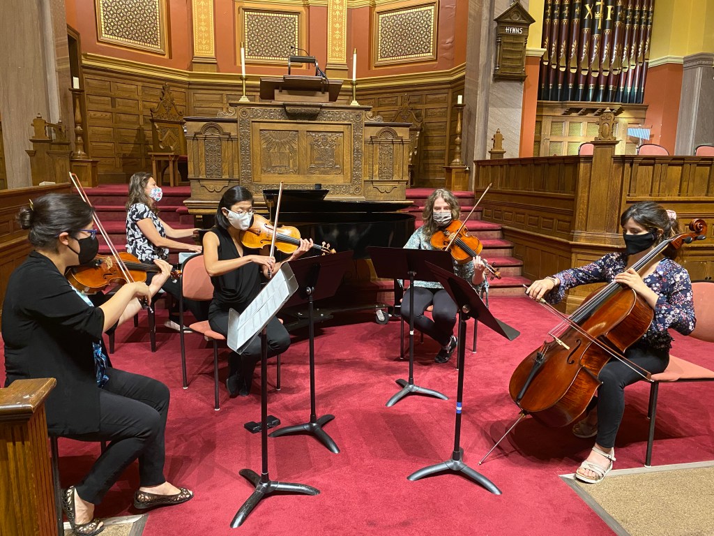 As spring moved to summer and summer to fall, gathering was still restricted and our venues remained firmly closed. Once again, the group convened on Zoom and continued weekly activity. A more ambitious virtual choir piece was planned, with string quartet and piano accompaniment. A recording session with masked players provided the instrumental track. The Rose, by Ola Gjeilo, was presented during a virtual concert, with archive videos from past seasons, solo performances, and spoken word. People from all over the country attended, many donating to Melodia. The recording of The Rose has received almost 10,000 views on Facebook and YouTube to date.