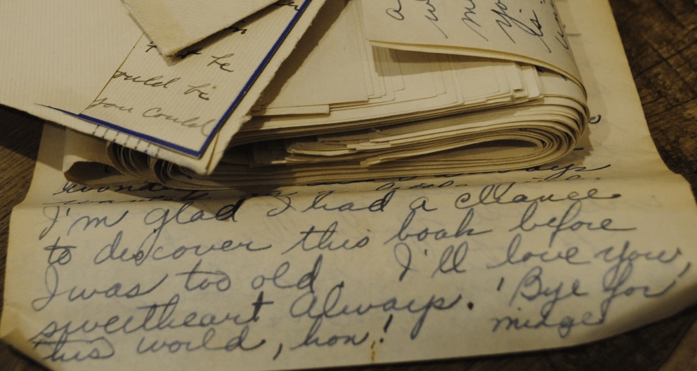 An excerpt from the last of twenty-eight unsent letters found in an attic in Pennsylvania, dated June 1944: “I believe this is to be my final chapter, but I just wanted another word with you before I closed ‘our book.’ It was fun reading it, but just as I feel when I close any book I love, I hate to part with the characters. They’ve become a part of my life and I a part of theirs. I never cease to profit from their lives and experiences. I owe much to you–the hero of ‘our story.’ You were wonderful–all I always wanted as a little girl. I’m glad I had a chance to discover this book before I was too old. I’ll love you, sweetheart, always. Bye for this world.”